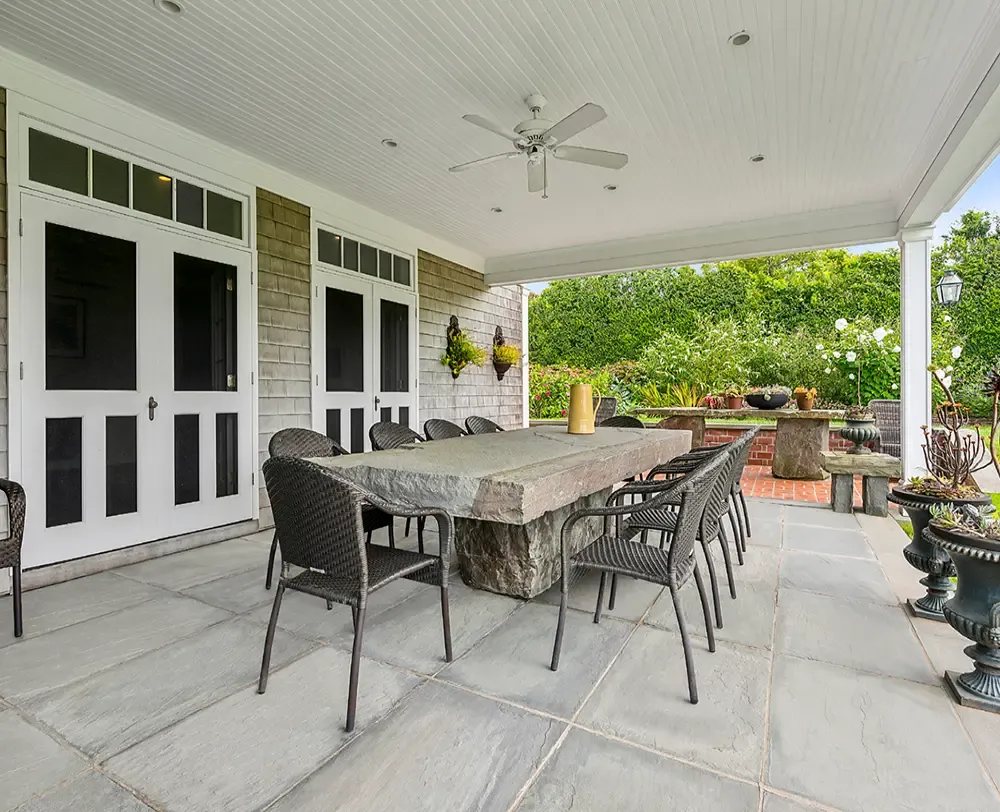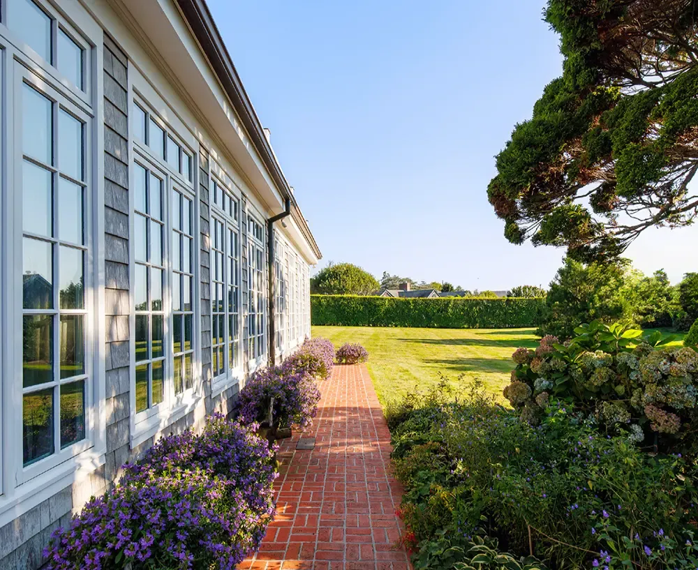 Today, what remains is a home that feels both timeless and alive; a harmonious balance between its late 19th century soul and Lichtenstein’s modernist touch. The 5,825-square-foot residence unfolds across three levels with an effortless rhythm. Light pours through oversized windows, casting shifting reflections across whitewashed walls and warm wood floors. The great room, anchored by a fireplace, feels like the heart of the home; its soaring glass doors opening onto terraces where the Atlantic breeze moves softly through the trees.