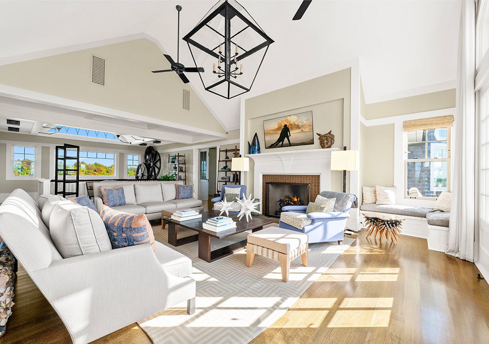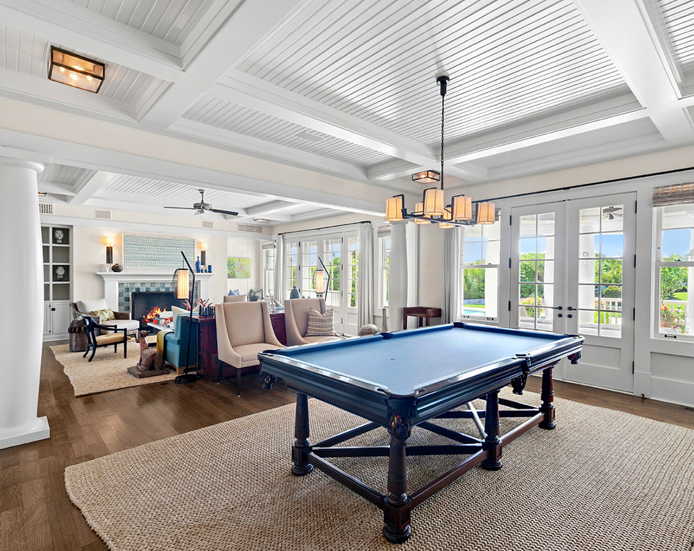 The principal living spaces unfold with a sense of ease. The living room, anchored by a refined hearth and coffered ceilings, captures sweeping views of sea and sky through French doors that open to terraces and manicured lawns. The adjoining media room elevates this connection even further with vaultedceilings and walls of glass that bring the horizon inside. Throughout, the palette is serene and tactile, a whisper of coastal elegance rather than a declaration.
