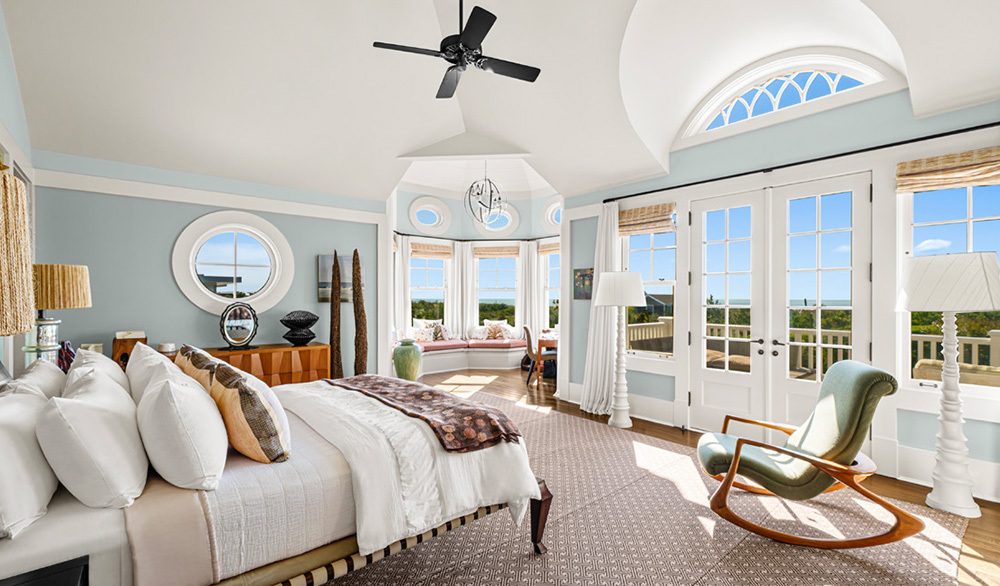 Upstairs, the private quarters offer sanctuary in its purest form. The primary suite commands a magnificent vantage point, with French doors opening to balconies that capture sunsets in full cinematic sweep. The suite’s volumes are generous yet soothing, its palette soft, its bath refined with subtle marble details and natural light that warms every surface. Guest suites continue the theme, offering quiet ocean views, graceful detailing, and a sense of privacy that encourages long, lingering stays.