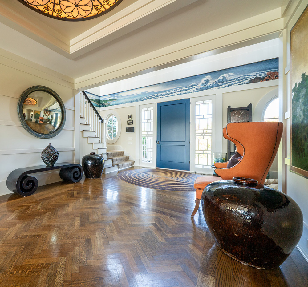 Inside, the foyer immediately establishes the home’s emotional tone. A soft wash of natural light drifts across finely rendered millwork, polished wood floors glow with warmth, and an ethereal hand painted mural of curling waves throughout the Hamptons four seasons stretches above as a reminder that the ocean is always near. This entrance does more than impress. It envelops you, quieting the mind and preparing you for the calm that permeates every room.